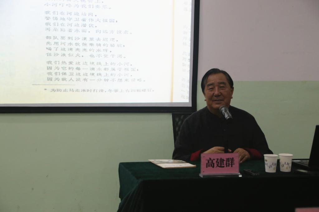 高建群结合四十余年的创作经历,围绕他的文化初心,用质朴的语言、生动的案例、契合的图片、真挚的情感为大家分享了创作的心路历程。他回忆了1972年在新疆阿勒泰地区严峻生活环境下作为一个火箭手的神圣和自豪,“把火箭弹从条状的弹药箱取出,擦去上面的黄油,一字儿摆开。在那一刻我对自己说,我是一名士兵,我的身后就是祖国,我不能后退半步。”接着,他展示了发表于1976年《解放军文艺》杂志上的处女作《边防线上》组诗,讲述了文学创作的初衷。他说“作为一个文化人,好好写作,不懈努力,让中国文学在自己生活的年代里,努力缩短和世界文学的距离。作家一旦和文学搭上边,就应把自己努力创作的一生作为祭品,献身给文学的缪斯女神。”高建群如是说,也是如此做的,从《边防线上》到《白房子》,从引发“陕军东征”的《最后一个匈奴》到《大平原》《统万城》《大刈镰》《我的黑走马》等,高建群依然坚持对党的信仰不改,坚持驻守祖国边防时对文学的初心不改,笔耕不辍的进行文学创作,遵循着自己的创作初心,稳稳前行。
