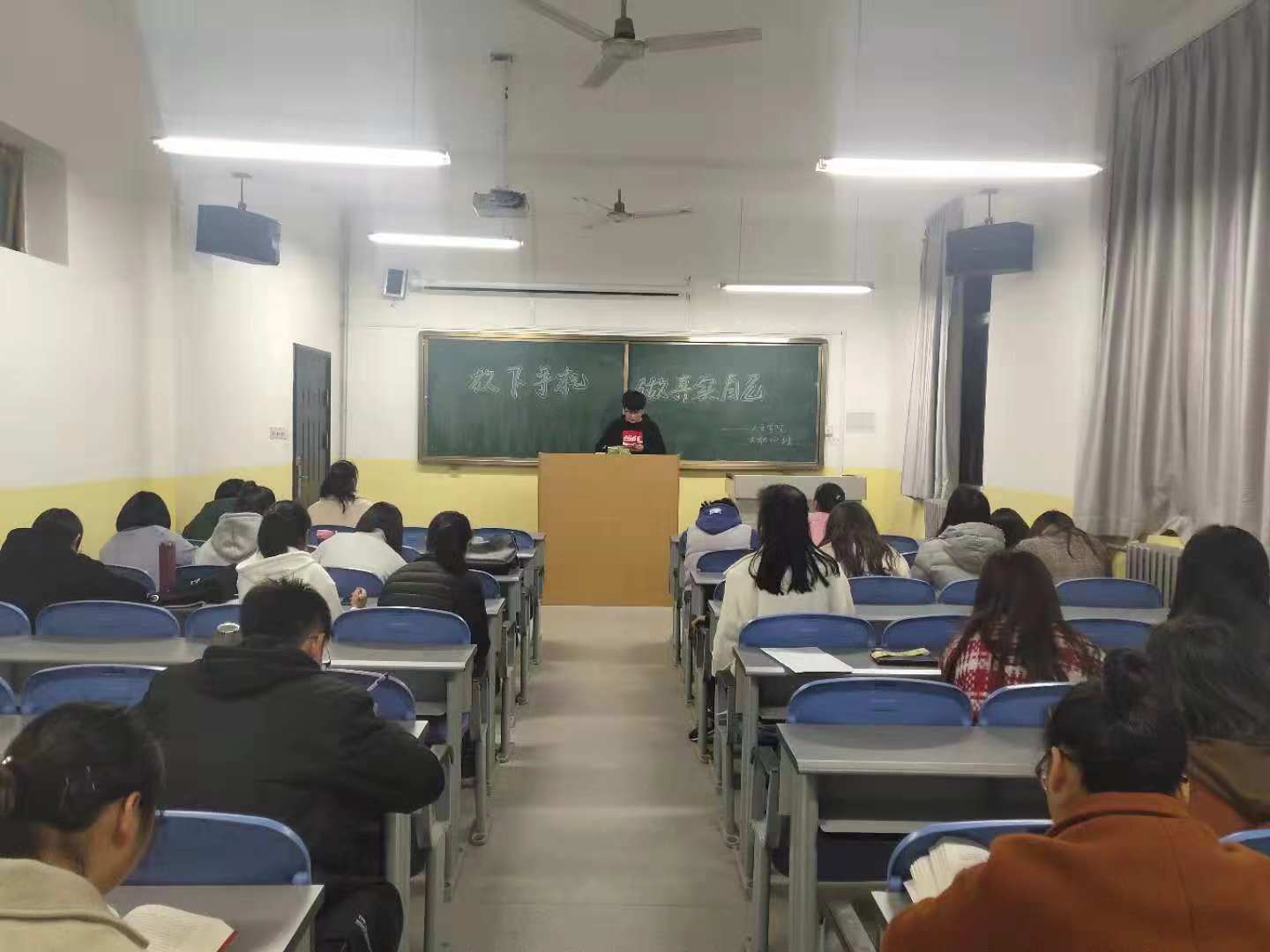 为推进学风建设,强化对课堂秩序的管理。太阳成集团tyc33455文秘181班于11月19日在南楼121教室开展了“放下手机,做真实的自己”主题班会,大一全体同学参加,心理委员刘新雨主持班会。