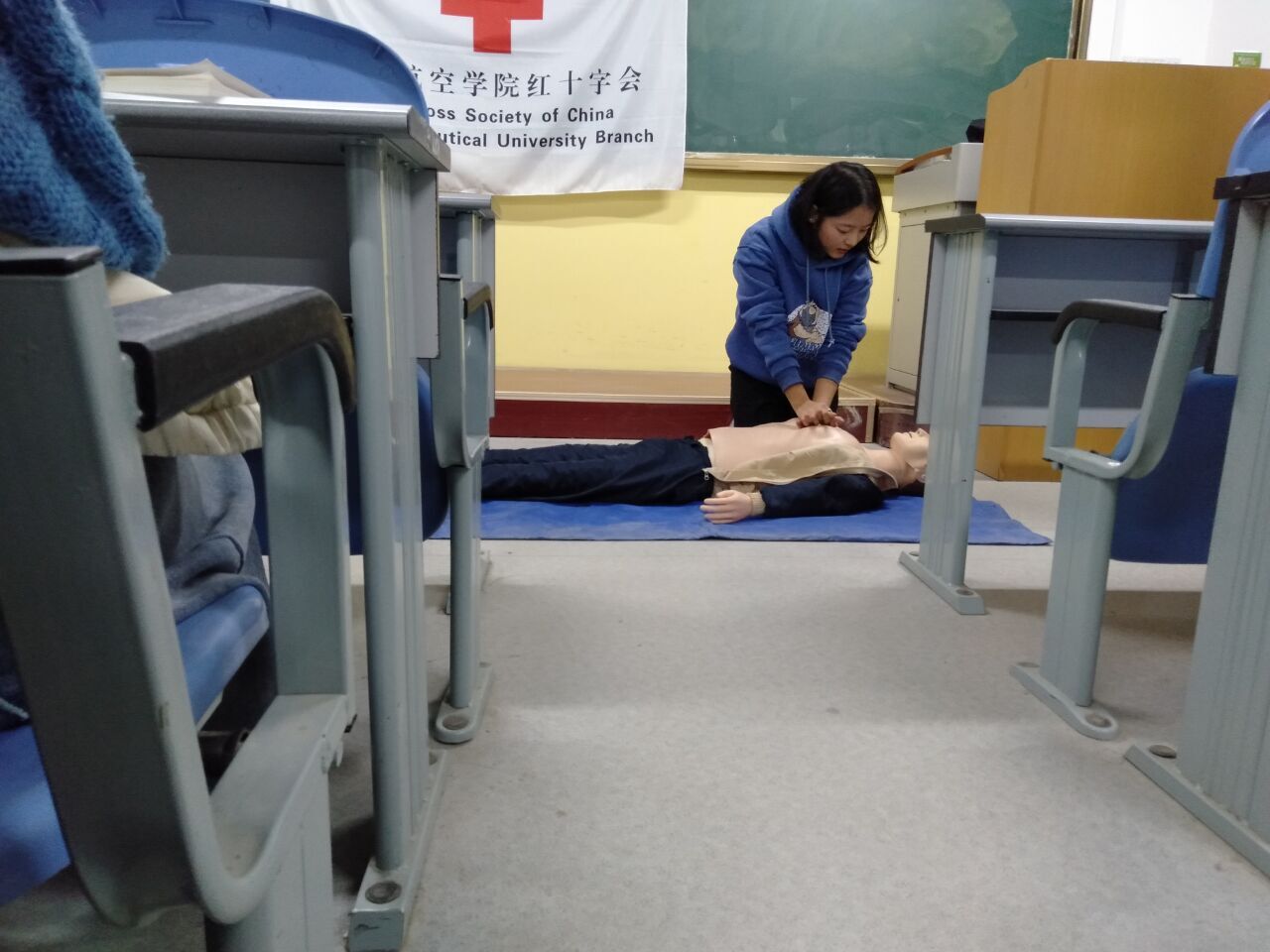 校红十字会培训部人员为同学们耐心讲解了心肺复苏、创伤包扎等救护原理及技术手段,让同学们分成小组,相互配合完成了创伤救护、止血包扎、模拟人心脏复苏等练习。随后,培训部人员准备了一个仿真人模,同学们在指导下演练了人工呼吸、胸外按压等技能。大家积极参与,培训部人员也在现场纠正了同学们的错误做法。