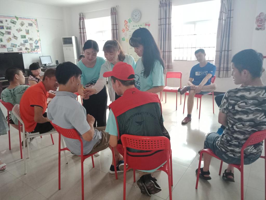 队员们首先进行了简单的自我介绍,与孩子们相互了解。随后,大家就日常生活中的学习情况展开交流。虽然有些智障儿童不能自如的交流,但同学们鼓励其大胆的说出内心想法,帮助他们表达自我。在玩游戏的环节中,孩子们先展示了自己制作的十字绣和贴画,之后和队员们一起唱歌跳舞。最后,队员们还为大家带来了精彩的手语操表演,融洽温馨的气氛感染了在场的每一个人。