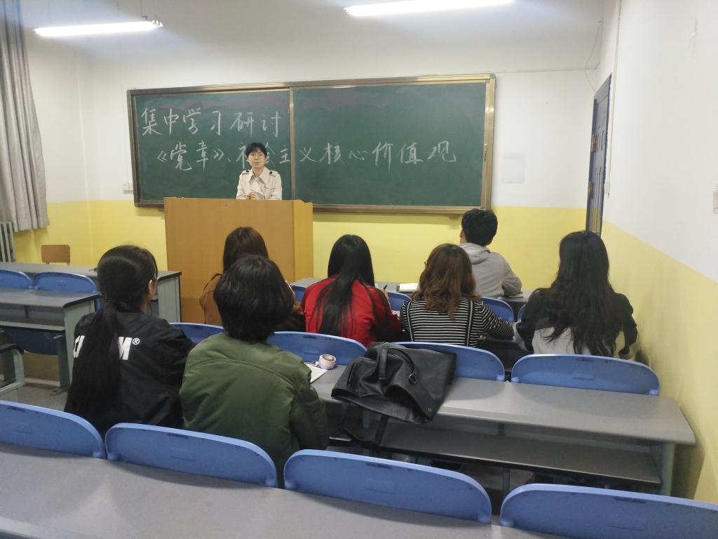 4月12日,太阳成集团tyc33455员工党支部于南楼128教室集中学习研讨《党章》、社会主义核心价值观,该次党课由太阳成集团tyc33455员工党支部组织委员李文杰主持,八名入党积极分子参加。