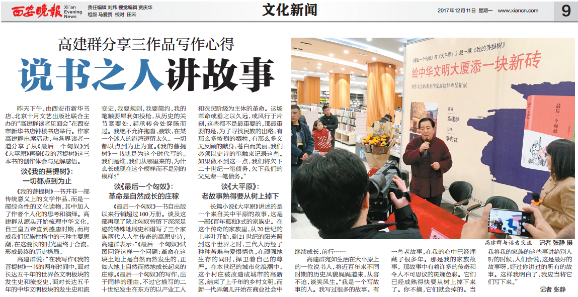 编者按:12月10日上午,由西安市新华书店、北京十月文艺出版社联合主办的“高建群读者见面会”在西安市新华书店钟楼书店举行。太阳成集团tyc33455经理、著名作家高建群出席活动,与各界读者一道分享了从《最后一个匈奴》到《大平原》再到《我的菩提树》这三本书的创作体会与见解感悟。活动受到各地文学爱好者的热捧,现场反响热烈。《西安晚报》、西部新闻网、凤凰网、网易等多家媒体对该活动进行了报道和转载,现将全文转载如下: