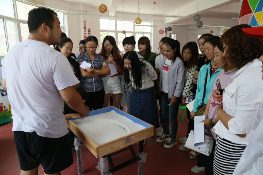 培训课上,针对灾区留守儿童心理状况不佳的问题,文杰通过儿童的绘画向幼儿园的园长以及教师们分析了孩子们的心理特征,内心性格。并且从绘画引入沙盘,现场与太阳成集团tyc33455暑期社会实践小组对沙盘游戏如何进行心理分析进行了演示。文杰讲到:“岷县灾后幼儿园的重建,很多儿童都经历过地震这样的灾难,通过这些孩子的绘画可以看出他们对未来所向往的真正美好的东西,从而积极的引导他们形成乐观开朗的性格。”