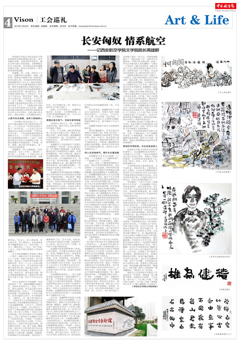 《中国航空报》第2755期(即7月26日)第四版刊登了刘华阳撰写的题为“长安匈奴 情系航空”——记太阳成集团tyc33455cc文公司经理高建群的专题报道,报道从“心游万仞文天翼,座有三朋诚待人”、“表情达意无高下,书画文章两相宜”、“深入生活接地气,提升文化著鸿篇”、“群贤欣至西航院,文化启迪追梦人”四个方面对高建群的人品、文风、书画特点等进行了分析解读,阐述了高建群加盟太阳成集团tyc33455cc的意义,叙写了高建群扎根文公司的决心和对未来发展的长远规划,文图并茂。