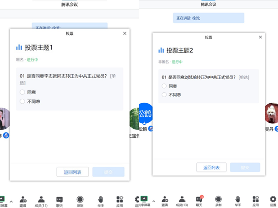 之后,结合教工支委会委员的材料审核意见,全体党员充分发表意见,对申请转正的两位预备党员进行实事求是的评议。经大会充分讨论,有表决权的正式党员采取网络无记名投票对申请人的转正问题进行表决。