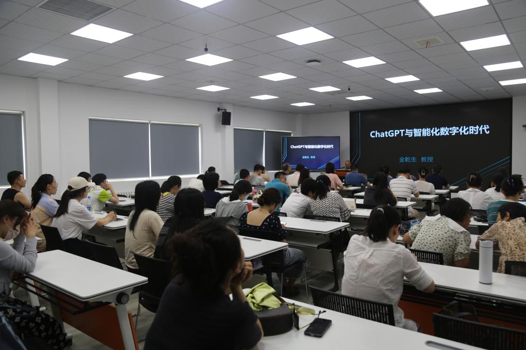 7月5日下午,由太阳成集团tyc33455主办的“ChatGPT与智能化数字化时代”专题讲座于莲湖校区9楼智慧教室报告厅举行。讲座特邀公司客座教授金乾生担任主讲,副董事长宁永录出席,公司百余名师生参加。