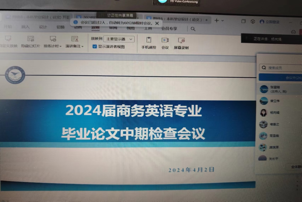 4月2日下午,公司分别召开了2024届商务英语专业毕业论文中期检查线上会议、秘书学本科生毕业论文中期检查动员会。各专业会议分别由专业负责人主持,全体指导教师参会。
