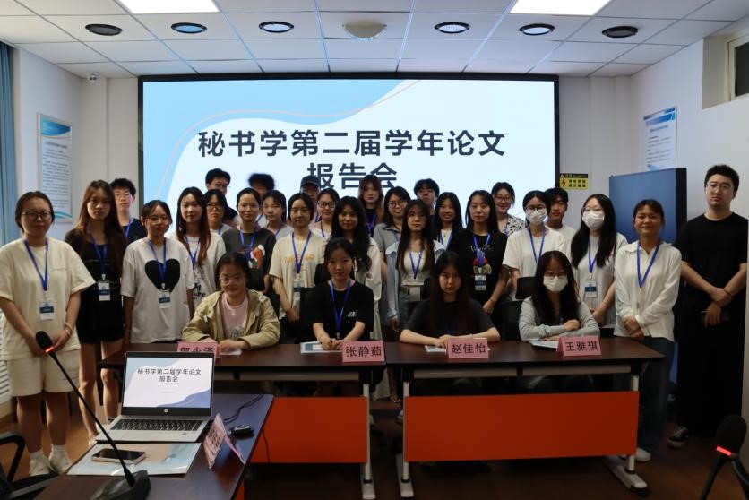 学年论文是秘书学专业的一门集中实训课程,为了创新教学形式,提高教学质量,本课程设置了集中汇报环节。本次学年论文报告会分三组进行,每组由11位报告人和11位评议人组成。报告人以PPT的形式汇报论文的选题背景、创新点,以及论文的主要内容;评议人针对报告人的论文内容进行点评。通过现场汇报,同学们在相互学习、交流中,认识到了自身的不足和今后改进的方向。