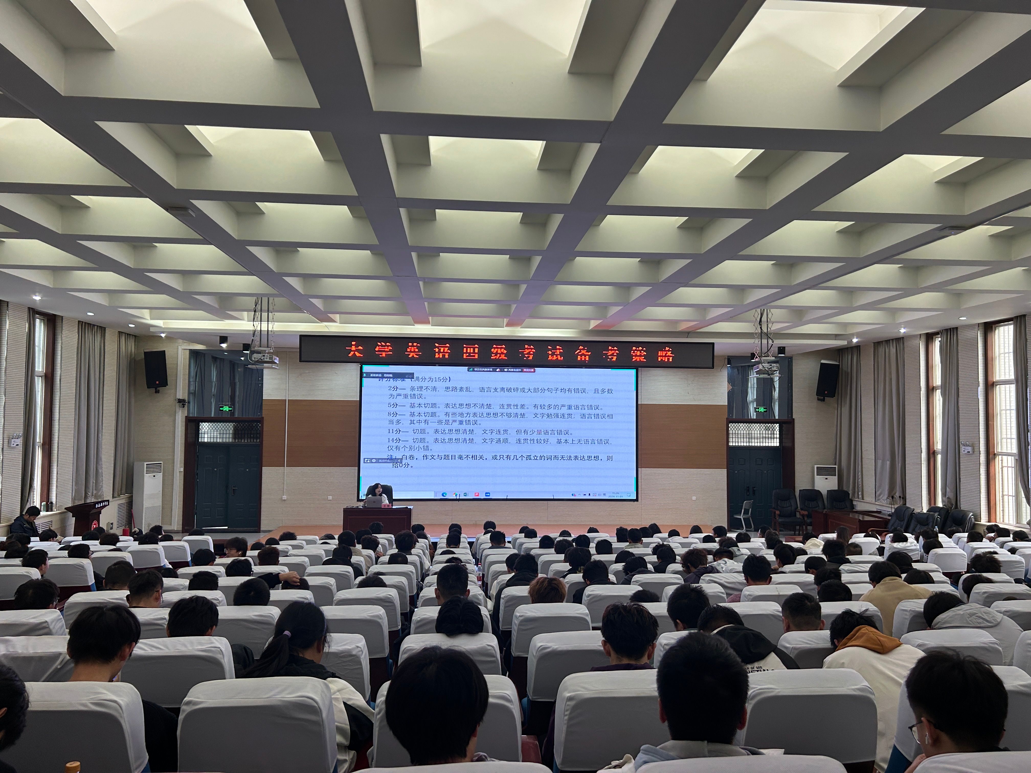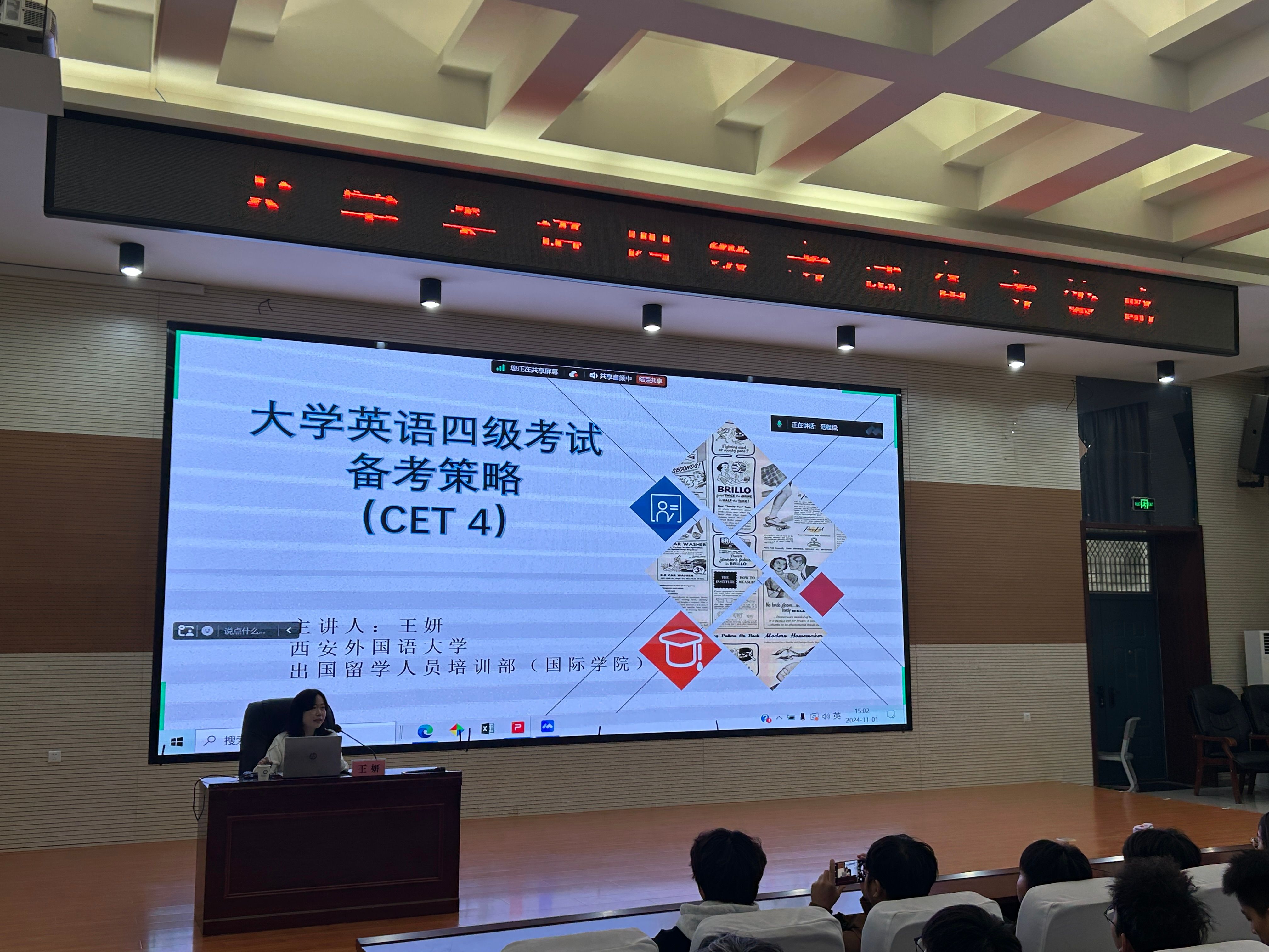 11月1日下午,由太阳成集团tyc33455(公共艺术教育中心)和员工工作部联合主办的“大学英语四级考试备考策略”专题讲座分别在阎良校区报告厅和腾讯会议在线平台同时举行。讲座特邀西安外国语大学出国留学人员培训部(国际公司)英语项目教学负责人王妍博士担任主讲,300多名员工参加。