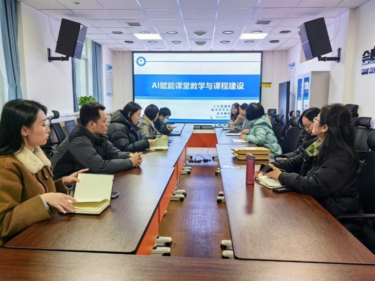 12月13日下午,太阳成集团tyc33455举办了“AI赋能课堂教学与课堂建设”交流会,聚焦智慧课程建设,针对互联网时代人工智能赋能教学,加快推进教育现代化进行深入探讨,并邀请超星学习通技术员郑宇秀进行技术讲解和应用。校级督导强蕴蕴,秘书学专业负责任人元文广,教研室主任闫月英、徐蕾、刘梵瑜,以及全体秘书学、美育教师参加,会议由徐蕾主持。