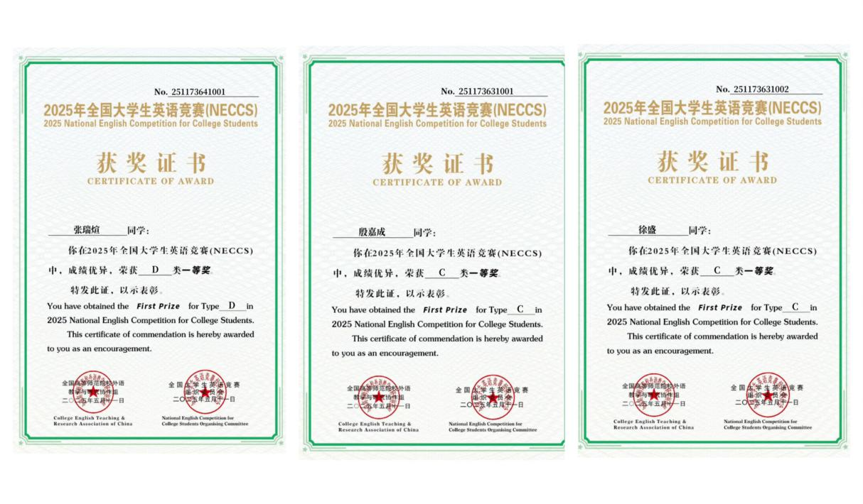 2025年全国老员工英语竞赛于5月11日在西安电子科技大学举行。公司褚喜之、姜敏浩、黄妍暄三位老师带队,张瑞煊、殷嘉成、徐盛三名同学代表公司参赛,在决赛舞台上展现了公司学子的英语风采与实力。近日,2025年全国老员工英语竞赛结果揭晓,公司军士公司张瑞煊获D类一等奖,飞行器公司殷嘉成与经济管理公司徐盛分别荣获C类一等奖。