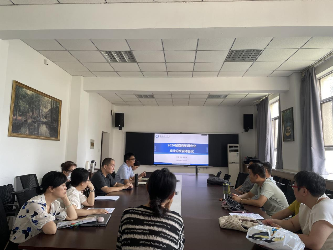 6月13日下午,英语专业教研室在南316召开2026届商务英语专业毕业论文启动会议。2026届全体毕业论文指导教师参加,会议由教研室主任张雷刚主持。