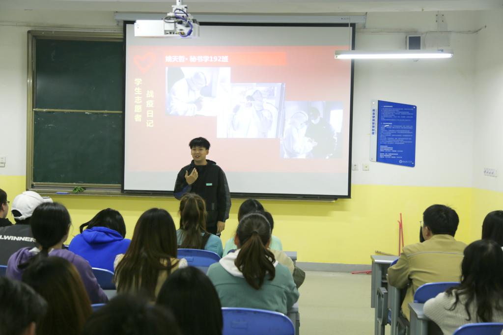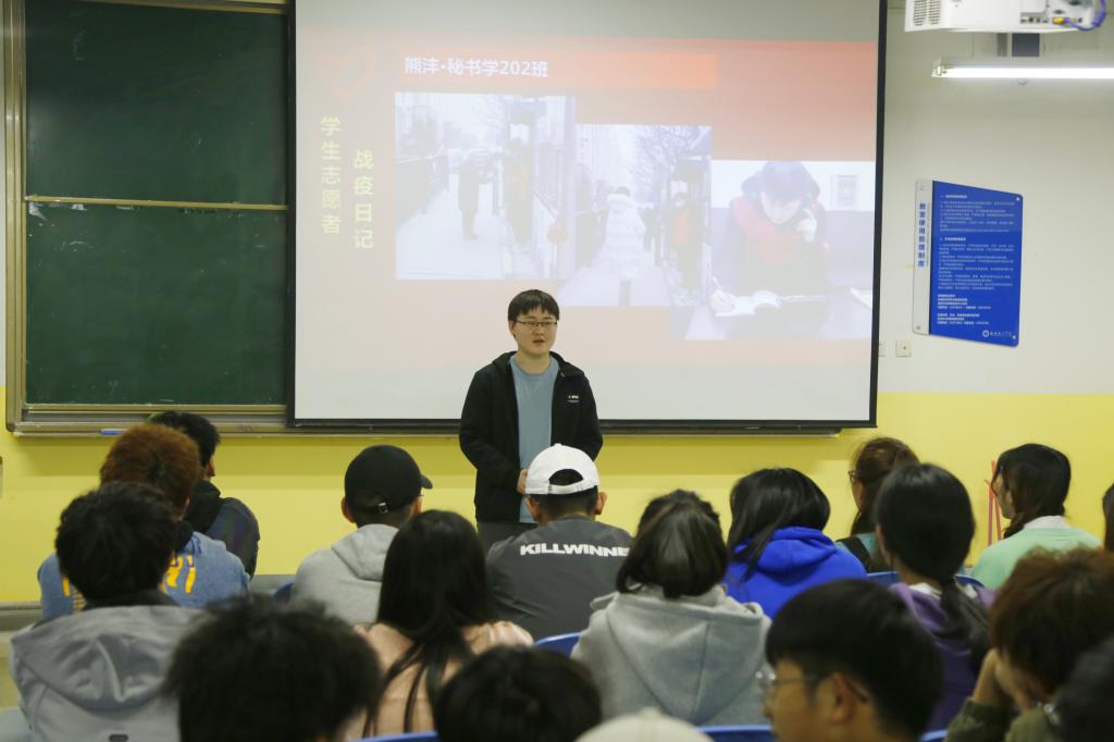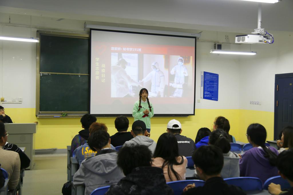 王创首先介绍了雷锋同志平凡而伟大的人生经历,“雷锋月”系列志愿服务活动进行了总结。随后,路紫妍、姚天哲、邢妍阿果、熊沣四位志愿者代表为大家分享了寒假期间参加疫情防控志愿服务的工作经历,讲述了自己在志愿服务工作中的感悟和收获,鼓励各位同学要从自身出发,脚踏实地的做好志愿服务工作,弘扬雷锋精神。最后,全体同学观看了《榜样5》纪录片,该纪录片集中展示疫情防控工作中涌现出的先进基层党组织和优秀共产党员风采,是学习宣传伟大抗疫精神,开展党员教育的生动教材。