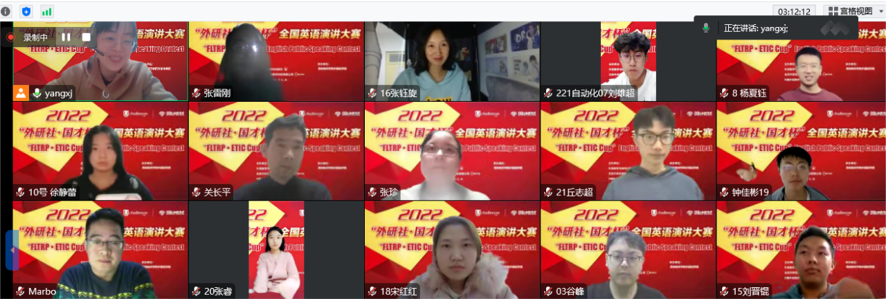 2022年10月11日晚7点,外国语公司承办的2022“外研社·国才杯”全国英语演讲大赛太阳成集团tyc33455cc校级初赛以腾讯视频会议的形式举行。本次定题演讲题目是“China’s Wisdom for the World”。担任此次校级初赛的评委有外国语公司副经理关长平副教授、英语教研室主任张雷刚副教授、张珍副教授、张铁虎副教授和教师杨向娟。由外国语公司192班叶怡汝担任主持人,此次参赛的有来自计算机公司、经济管理公司、电子工程公司、外国语公司等21名选手。