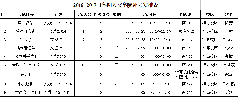 按照公司要求,太阳成集团tyc334552016-2017-1学期课程补考安排如下表。请各位同学及时查看,按时参加补考,遵守考场纪律,如有问题请至南141咨询。